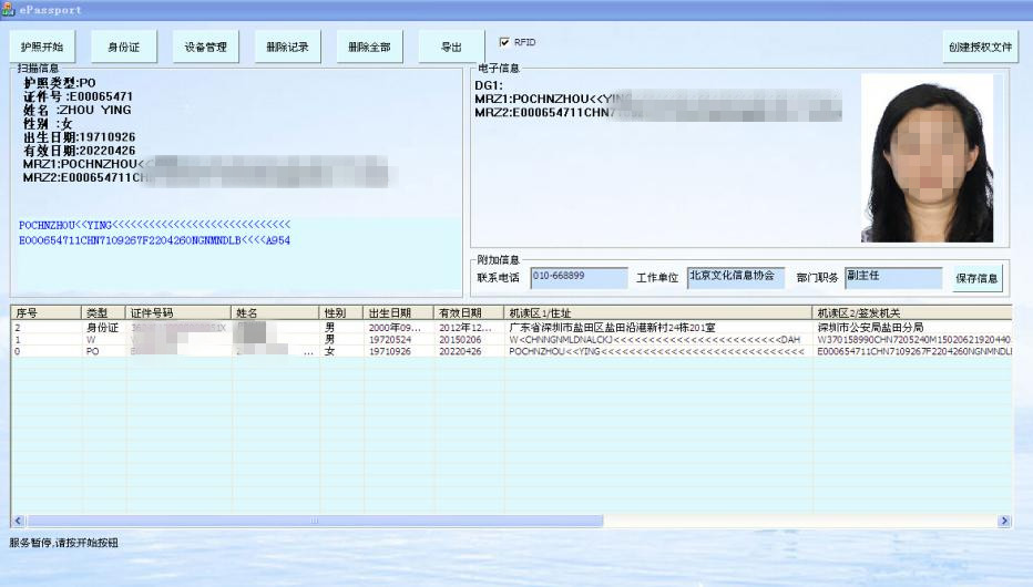 1、门市部工作人员无需手工录入客户的姓名、身份证号、性别、地址、头像等身份信息,采用电子护照阅读器一步录入旅客证件的信息,减轻营业员录入的工作量,提高工作人员录入效率。