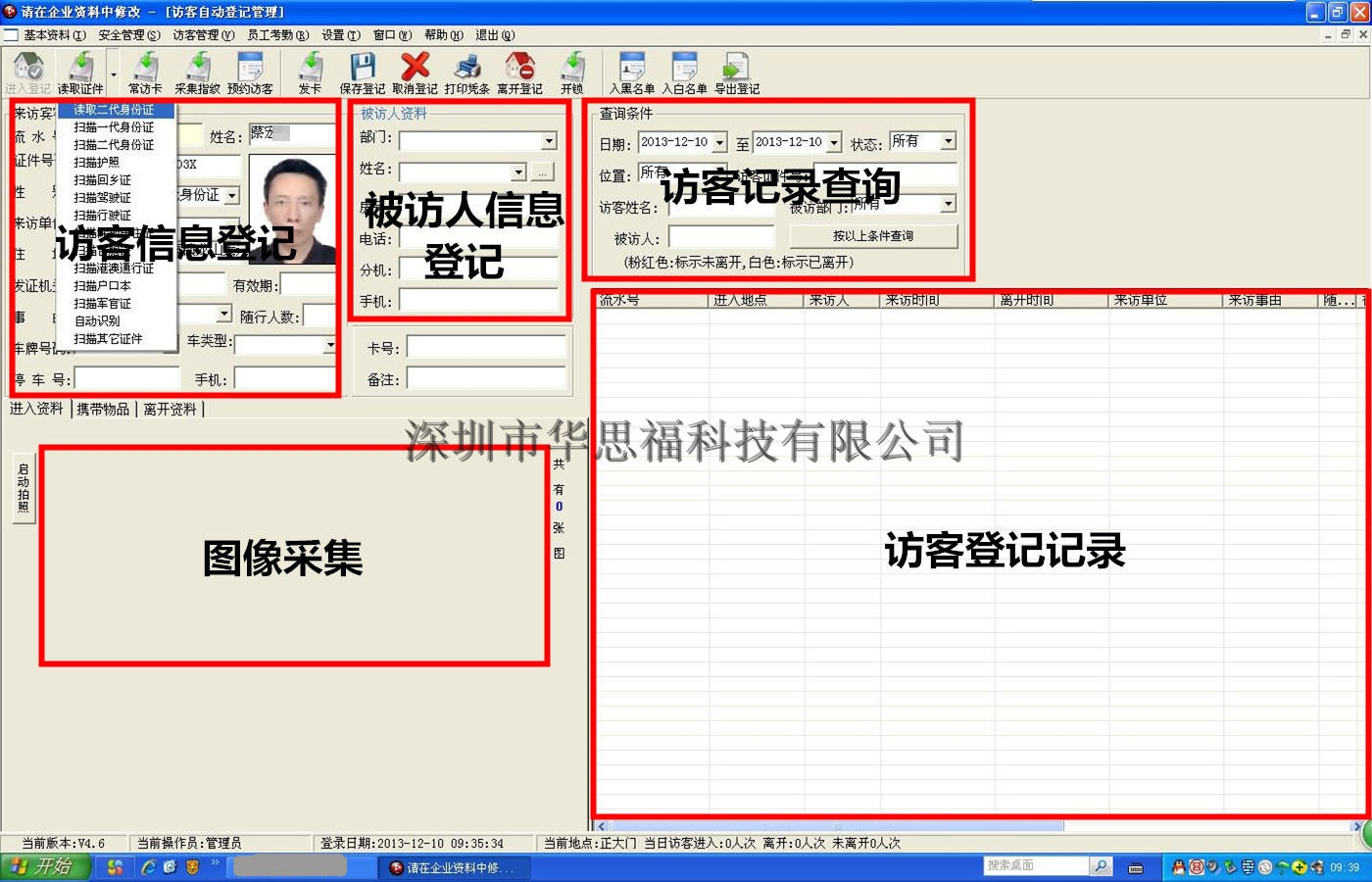 ●证件图片保存:可以有效保存来访人的照片和身份证,来访事由,携带物品等资料,保证资料的真实完整。可以方便门卫工作人员快速辨认来访人。