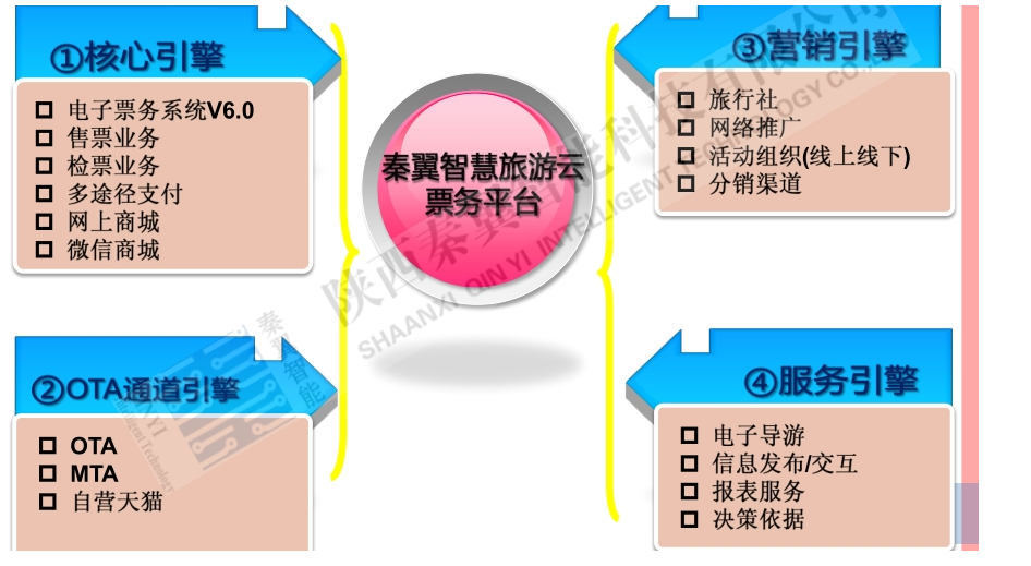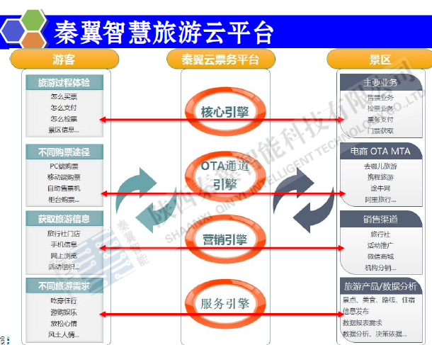 智慧旅游云平台由四大引擎组成:核心引擎、营销引擎、OTA通道引擎、服务引擎
