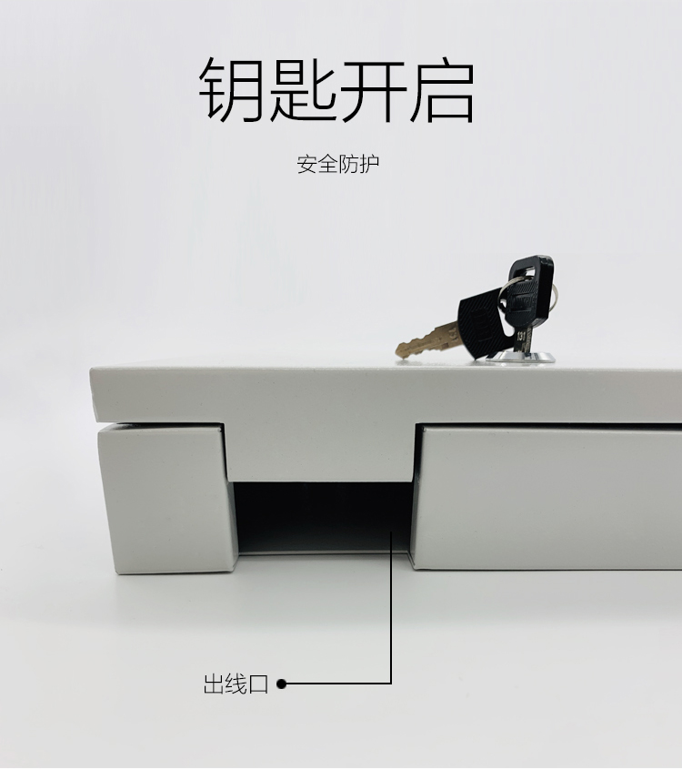 大厅自助设备区域采用自主研发刚性防护管理系统,产品具有防水防鼠防尘及带锁等特性,材料采用抗氧化、耐酸碱、防腐蚀的喷塑钣金,有效解决了线路杂乱、裸露线路及电源插座和信息点插座无保护、外接线板裸露容易引起小孩误摸触电等问题。