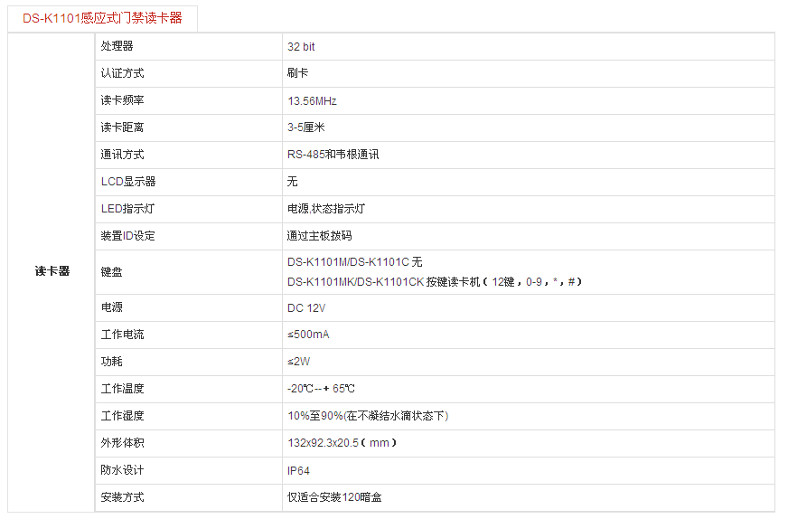 海康威视 DS-K1101系列读卡机 感应式门禁读卡机
