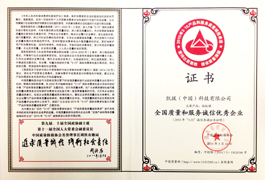国际消费者权益保护日3.15,凯拔(中国)科技有限公司受邀参与由国家质检总局•中国质量检验协会主办的2015年“3.15”国际消费者权益日“质量和服务诚信承诺”活动,并荣获“全国质量和服务诚信优秀企业”证书,凭借对产品质量的严格把控,以及对消费者负责的态度,至此公司已连续多年获得此项殊荣,此后将继续以顾客的满意为企业宗旨,用坚持创造产品,凭良心打造精品,塑造一流企业!