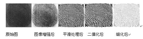 指纹图像预处理的目的主要是为特征值提取的有效性、准确性作好准备。过程包括指纹图像增强、指纹图像平滑处理、指纹图像二值化以及指纹图像细化等。这些均为了使指纹图像更加清晰真实,便于识别。
