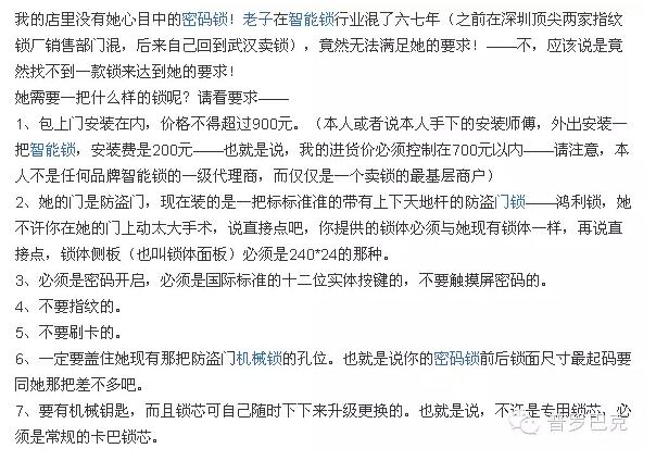 近期,我听到了这样一件事,就是一位消费者在购买指纹锁的时候,对指纹锁的品质要求甚高,而其心理价格仅700元(包含锁、辅料及安装),并且是听其好友的购买经验得之。在某宝上一看,三位数的指纹锁不在少数,竟还有不少人去购买。