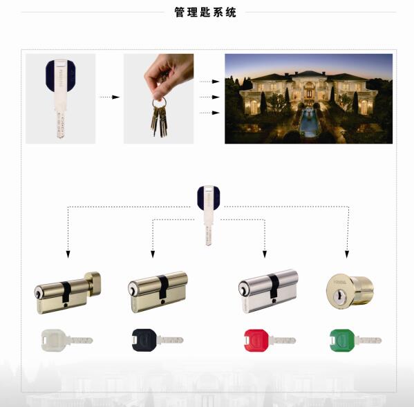 根据开锁的权限,总钥匙系统可以分为:二级钥匙管理系统,三级钥匙管理系统,以此类推,目前KABA高级防盗锁芯的管理系统可以达到6级以上。