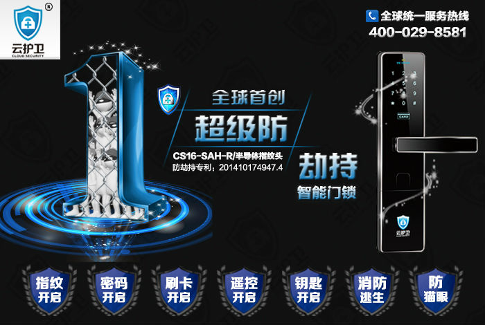 “云护卫”超级防劫持智能门锁是本公司自主研发的一款高科技智能产品,主要采用云护卫联防报警系统,运用物联网原理开启,当门户受到安全威胁时,现场即刻录像并上传图像到云护卫报警中心,云护卫报警中心与物业及110共同出警。此外,该产品还具有多项功能,如:手机开启、指纹开启、密码开启、感应卡开启、遥控开启、机械钥匙开启、防猫眼盗窃、消防逃生通道、智能安防联动等,同时附带财产盗抢险、意外伤害险、意外医疗险,彻底保障人身、财产双向安全。