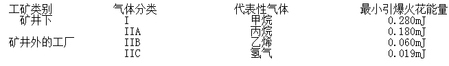 以上四个类别主要是根据不同工况下可能引爆的最小火花能量,我国和欧洲及世界上大部分国家和地区将爆炸性气体分此四个危险等级,具体区别如下表: