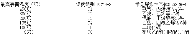 其次,根据爆炸性气体混合物按引燃温度的差异,组别又分为T1、T2、T3、T4、T5、T6六种(T6安全级别最高,也就是设备表面温度越低越好):