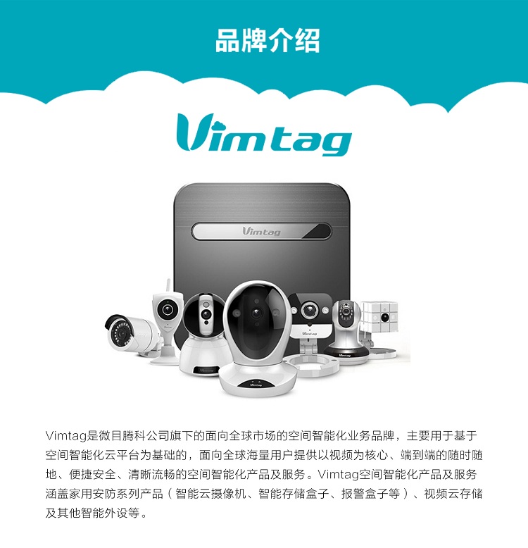 Vimtag微目腾科作为较早一批进入安防监控的企业,推出了在行业类产品清晰度、流畅性、架构方面都具有明显领先优势的Vimtag智能云摄像机,在中国、欧洲、美国等世界主要地区建立空间智能化服务云平台,同时,vimtag智能摄像机高端品质已经获得了欧美用户的认可,销量在欧美地区处于领先地位。目前Vimtag微目腾科已回归国内,为国内用户提供高端品质的智能摄像机产品,已面向全国各地市诚招代理合作伙伴。