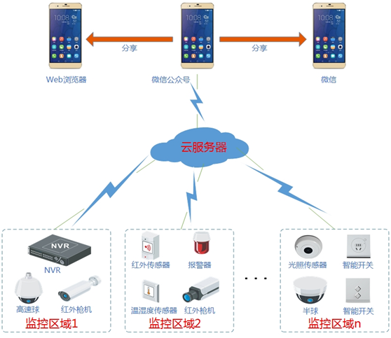 云平台是指将云盾安防平台部署在云服务器上,使用PC客户端、手机APP、微信公众号平台等客户端,通过互联网为用户提供视音频播放、录像点播、智能控制等服务的综合安防监控平台。