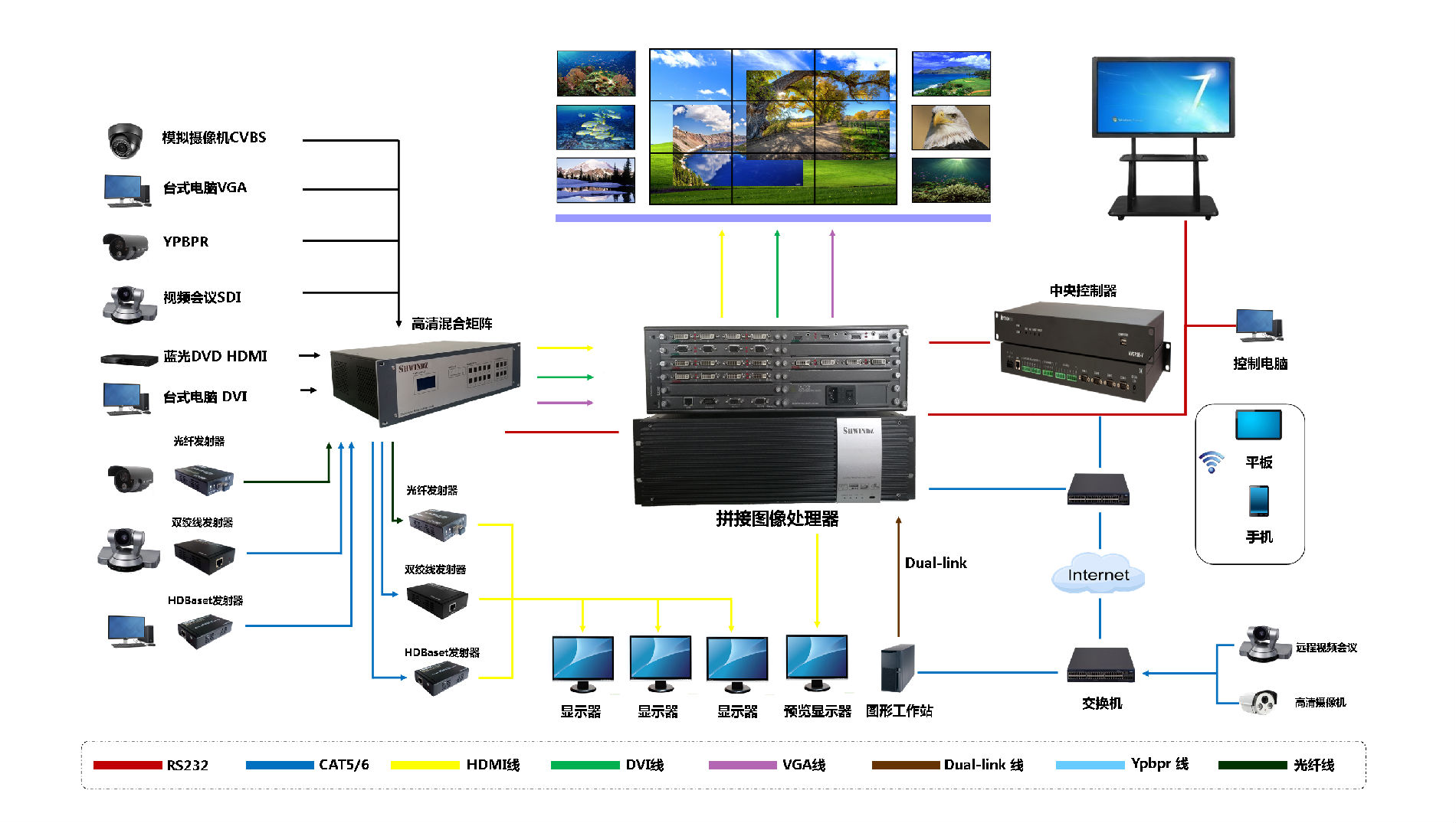 板卡参数 | 输入卡 | 多种输入卡可任意组合:DVI、VGA、CVBS、HDMI、3G-SDI、YPbPr、Dual-Link IP HDbase-T、光纤等 |