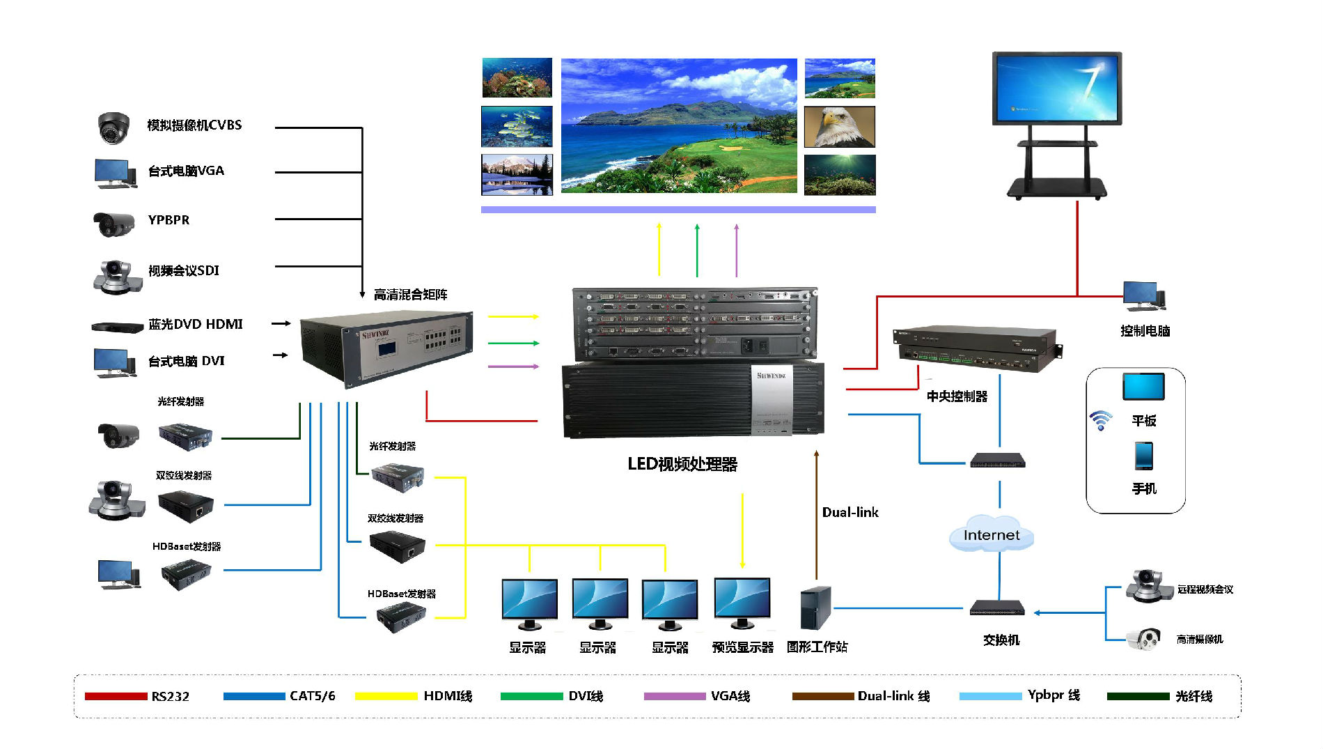 4. 支持BNC、VGA、RGB、HDMI、DVI、3G/HD/SD-SDI、IP流、光纤信号、HDBase多种信号格式输入;
