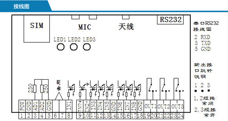 ● 有八路开关量光电耦融离输入、两路模拟通道输入、三路继电器输出。
