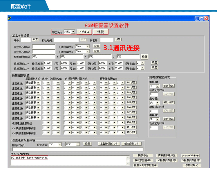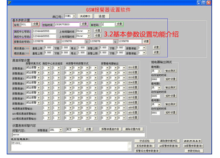 ● 报警器具有三路继电器输出,可以设置输入通道报警时继电器输出,也可以短信进行控制输出。