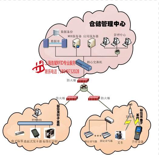 图2‑1物流与供应链管理系统逻辑结构图 上图显示RFID识别系统各组成部分的逻辑关系以及与用户现有业务系统的逻辑关系。上层应用的各个应用模块管理中心业务、仓储终端业务、手持终端业务与中间件进行数据交换;中间件根据应用模块子模块的指令,通过数据传输层操纵硬件设备(包括固定式读写器、手持式数据采集器、RFID发卡器),并获取硬件设备返回的数据;硬件设备则根据中间件的指令读取或打印电子标签,并且中间件还负责应用程序和数据库之间的数据交换。 系统在整体设计的时候预留了标准的数据接口,以方便和用户现有的业务系统(ERP系统)之间的数据交换。 2.3.系统拓扑结构 物流与供应链管理系统由中心管理子系统、仓库作业管理系统、手持终端作业系统组成,这几个系统互相联系共同实现对仓储物资的贴标、入库、出库、盘库、移库等各个作业环节数据快速准确的采集,确保企业及时准确地掌握库存的真实数据,合理的保持和控制企业库存,有效的提高仓储管理效率、降低运营成本。