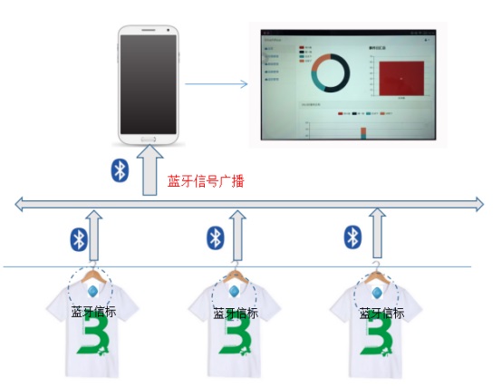 为每件陈列商品绑定一个蓝牙信标,当有人对其感兴趣、摸一摸、比试一下、试穿后蓝牙信标会将以上信息主动发射,通过手机或者平板的蓝牙接口统计该类商品的触摸率、翻动率与试穿率。手机或者平板将收集到有价值数据通过WIFI或4G交互至后台服务器,后台对所有数据进行整理与分类,以各类报表或各种检索形式呈现。