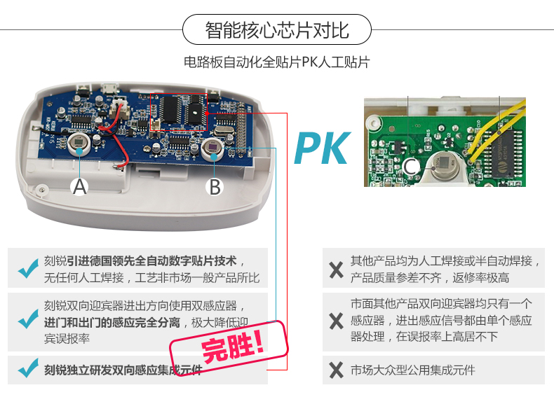 ●自动检测自动识别进出方向,提示不同语音 ●新增加多个节日语音,童声语音 迎宾、防盗多功能 ●独特的刻锐专利省电技术 ●最多可学习30个无线配件