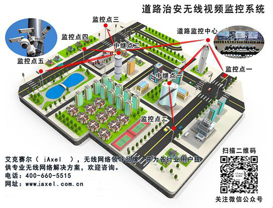 艾克赛尔道路交通无线视频监控系统,是在原有的以太网监控系统的基础上,用无线微波进行数据传输,克服了复杂地形对有线网络建设的限制,传输质量稳定,降低了网络建设成本,大大增强了监控系统的灵活性、便利性和可扩充性。