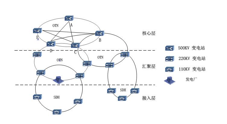 某省供电局在下一个五年规划中(至2020年)建成12个500KV站点,其中A点将建成两个站点,E点建成4个站点,B点建成3个站点,C点建成两个站点,D点建成1个站点。根据业务承载策略及某供电局下一个五年规划,建议将12个500KV变电站建立核心层框架,220KV及部分110KV变电站及个发电厂站建立汇聚层框架,110KV变电站通过接入层上联至汇聚层。根据业务的流量、流向特点以及采用传输技术的特性,骨干层采用OTN技术进行组网建设,以达到光方向连接丰富、光纤资源使用率高、业务调度灵活的特点。汇聚层业务调度灵活性要求没核心层那么高,但也承载GE及以上业务,因此也采用OTN组网,以环形组网方式进行建设。考虑到接入层业务流量在155Mbit/及其以下,因此将继续建设SDH网,并采用环形组网。由于OTN的引入和规模应用需要一定的完善过程,因此目前OTN和原有的SDH网络要顺畅实现共存和互通。