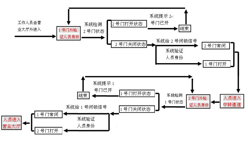 对没有开门身份的人员,在被允许进入的情况下,可按下营业室内的开门按钮(每道门对应一个按钮),可实现开门,但受互锁联动逻辑关系的限制。