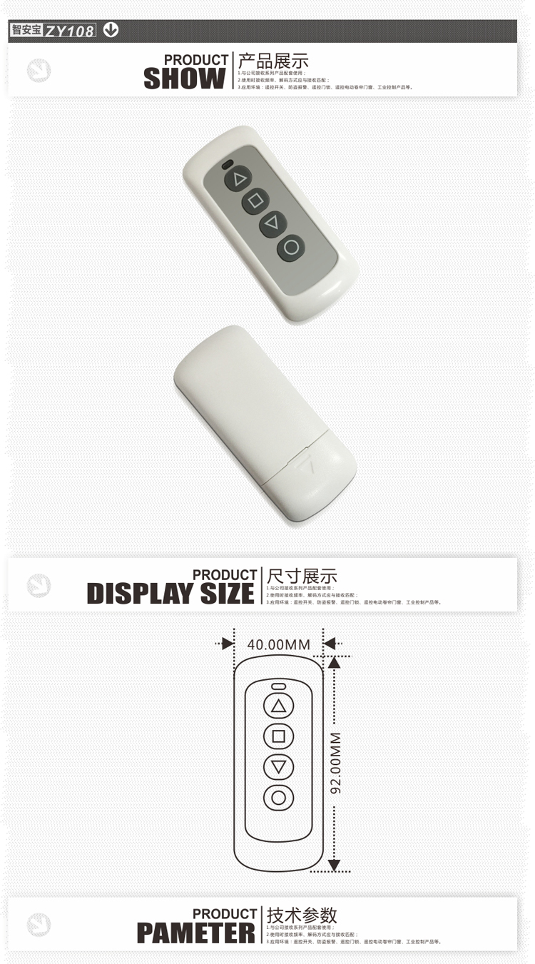 遥控开关、防盗报警、智能门锁、伸缩门、泵车、报警器材、遥控门锁、无线遥控晾衣架、无线遥控投影仪、遥控电动卷帘门窗、水泵遥控、遥控车库门、遥控各类开关控制器、工业控制产品等