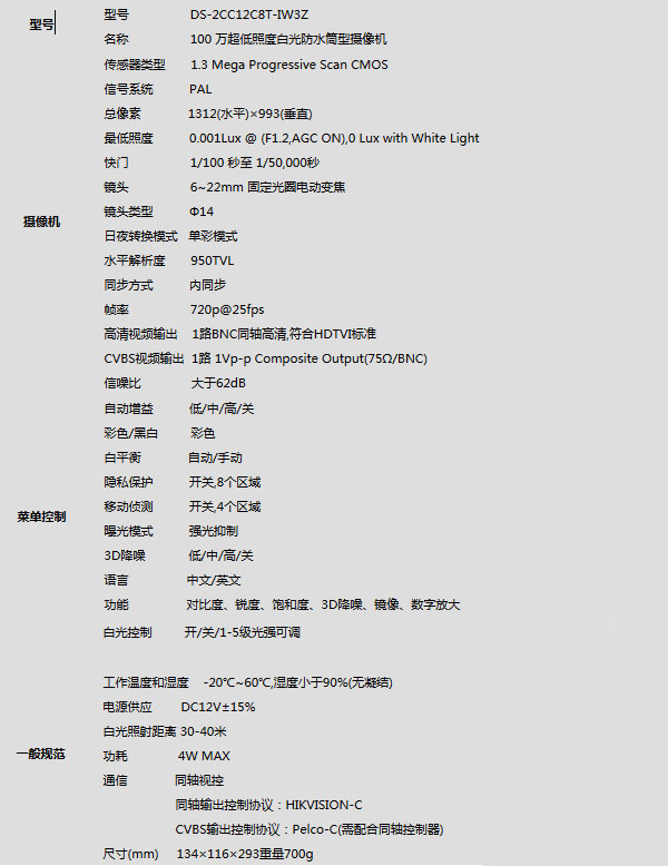 - 型号:H系列720p DS-2CC12C8T-IW3Z