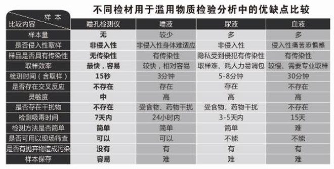 主要通过光对瞳孔的刺激把中枢神经系统的信息通过瞳孔的变化反应出来,吸毒成瘾人员的中枢神经系统一定程度上是被破坏的,这些信息就会反射到瞳孔,我们的产品就是通过光来刺激瞳孔,通过瞳孔的变化来判断被检测者是否为吸毒人员,该技术原理已经通过中国科学院鉴定,技术产品也通过了公安部鉴定。