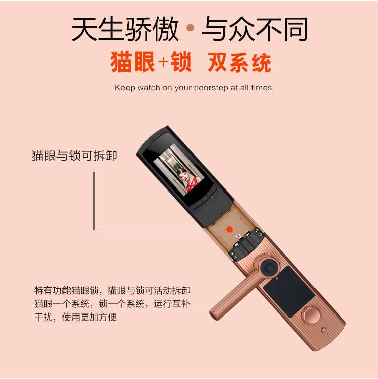 当门外有可疑人物逗留时,猫眼锁会自动发生抱紧,并将这一信息第一时间将视频通过APP传送给客户。