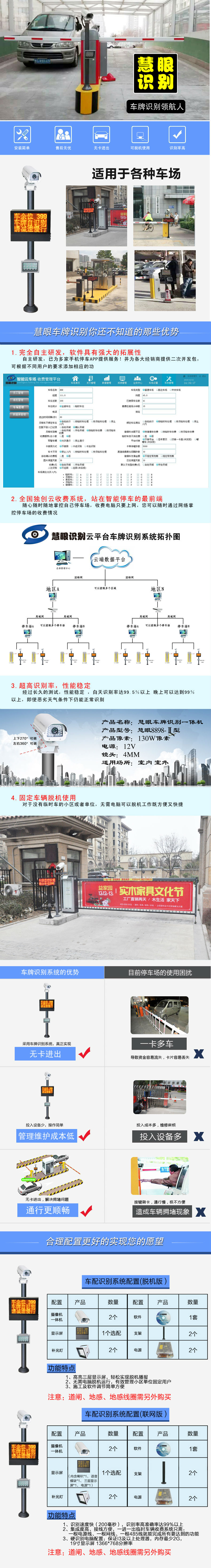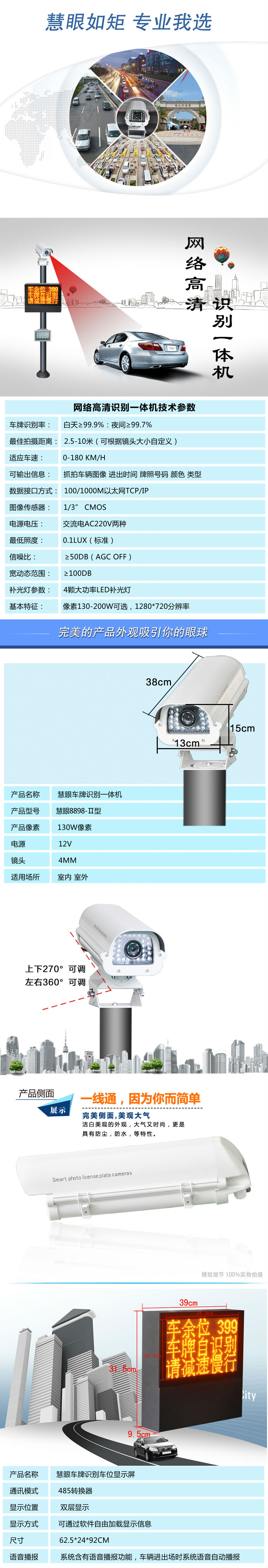车牌识别一体机、车牌识别仪、车牌识别专用补光灯、车牌识别应用系统解决方案、 车牌识别软件开发包等。产品采用先进生产线规模化、专业研发、标准化生产,检测流程严格、规范。