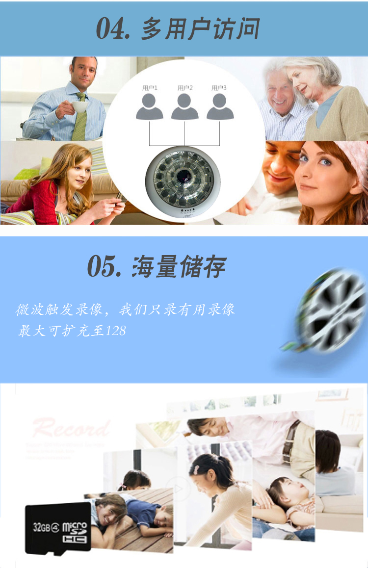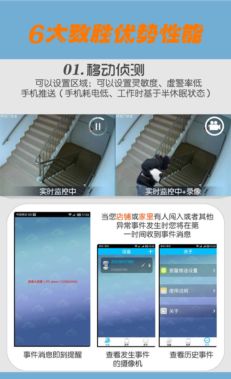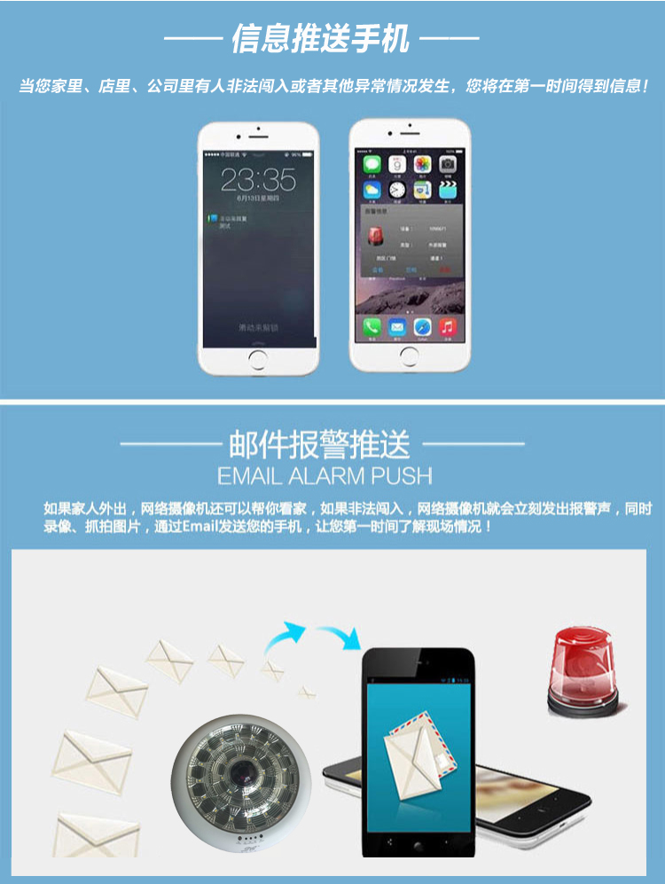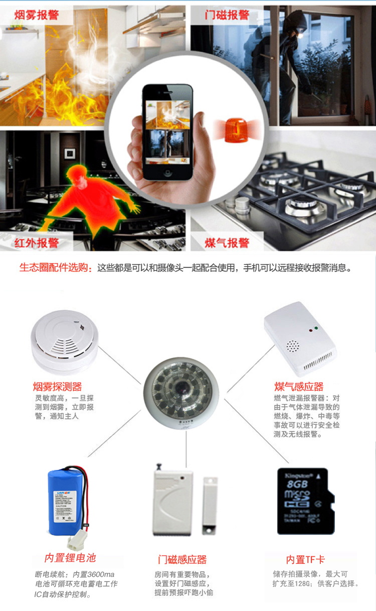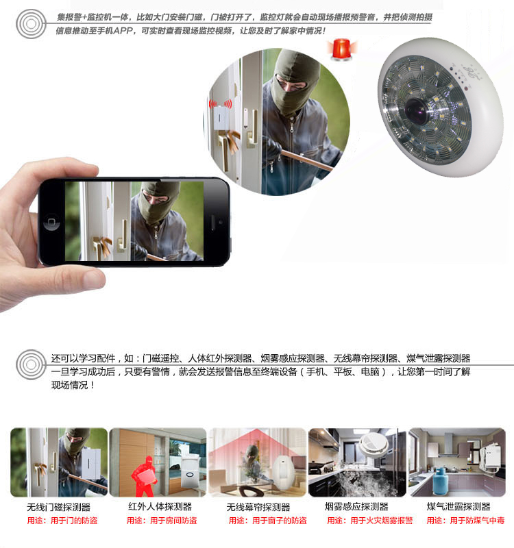 兼容各种无线烟感,煤气探头,报警门磁,等报警系器接入,最大8防区 ,共64路报警信号接入,,检测到有人异常闯入,会自动推送报警情况到5部手机上,并马上实现手机与摄像机实时对话。