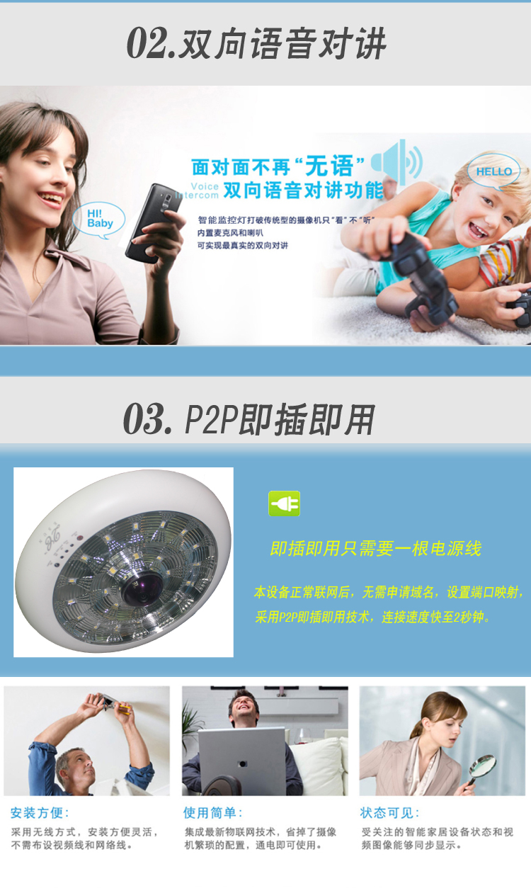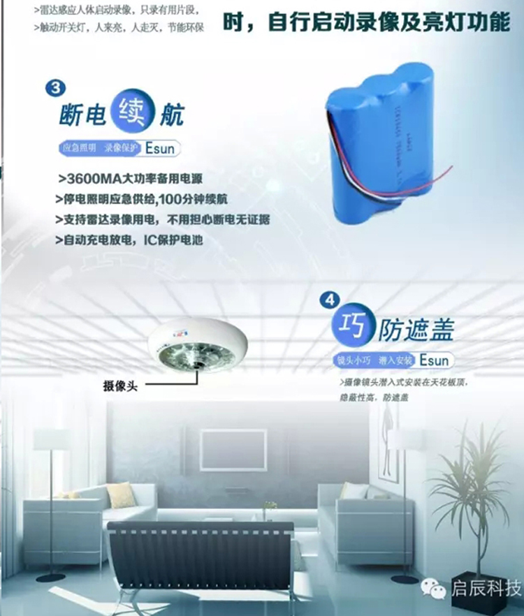 智能监控灯属于潜入式安装,让监控摄像处于十分隐蔽的天花板,巧妙防止被遮盖。
