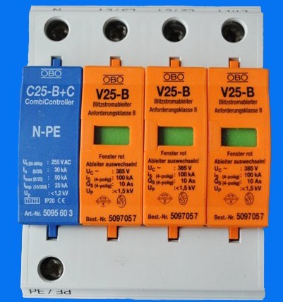 V25-B防雷器应用 当建筑物本身设有外部避雷系统(如安装有避雷针、引下线、地网、外部屏蔽时),根据IEC、VDE相关理论,在其建筑物内部的380V/230V低压配电电路上,采用OBO V25-B/3+NPE/FS来建立电源线上的雷电保护等电位连接,可以避免雷电发生时引起的失火、爆炸、人身伤亡的危害。