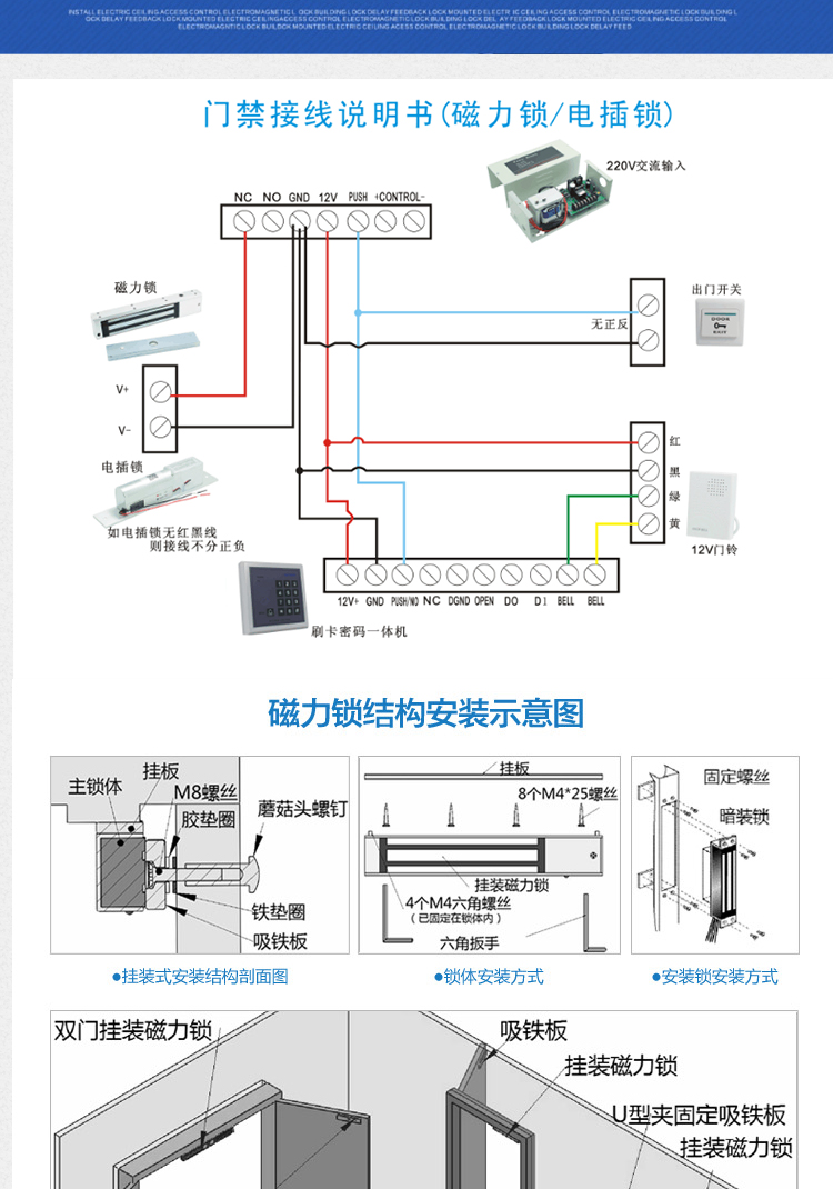 门禁电源 门禁读头 电插锁 磁力锁 门禁一体机 开关 控制板 有线门铃 接12V电源专用门铃 可视有线对讲门禁机 人行通道闸 停车场设备等一系列产品。