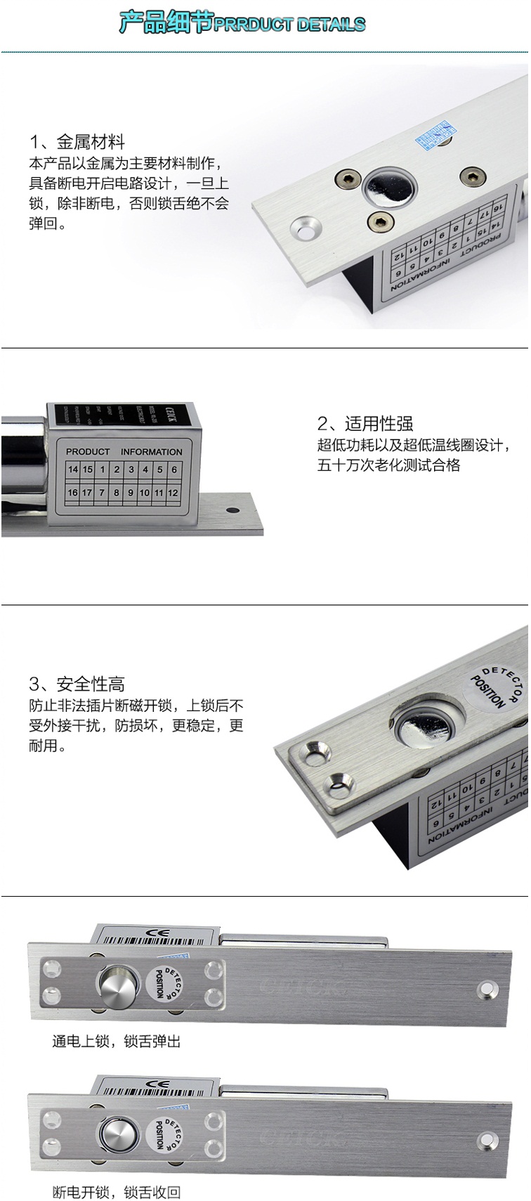 3、工作电流:这个指标与锁舌力量有关,也与锁体工作状态下的温度有关。设计准确的电插锁应在这两者之间找到平衡。