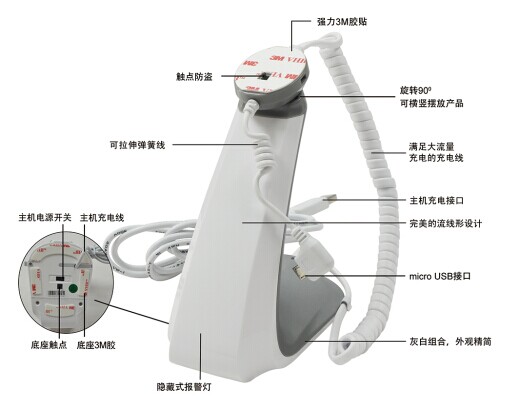 M012系列采用的是2.4G无线解码技术,独立解锁系统,安全可靠。多触点防盗报警,小触点设在连接器与底部座。每个展示座配备独立防盗装备,安全可靠。