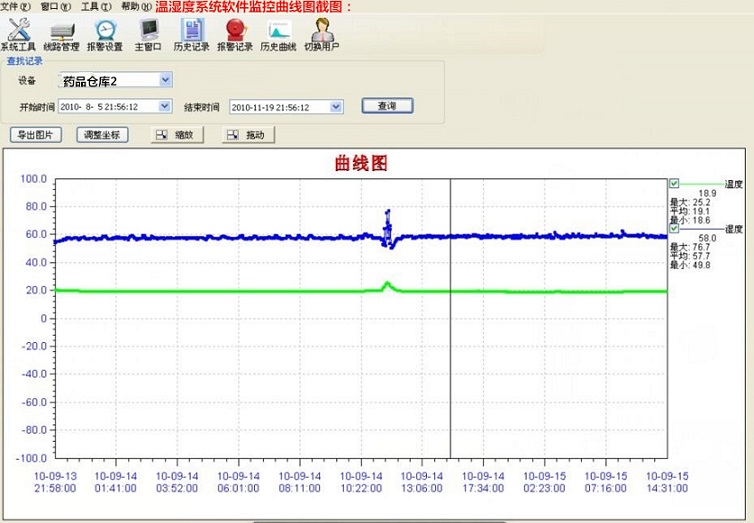 3、温湿度监控系统的温湿度监测软件(G-NET)采用标准windows 98/2000/XP全中文图形界面,实时显示、记录各监测点的温湿度值和曲线变化,统计温度数据的历史数据、最大值、最小值及平均值,累积数据,报警画面。