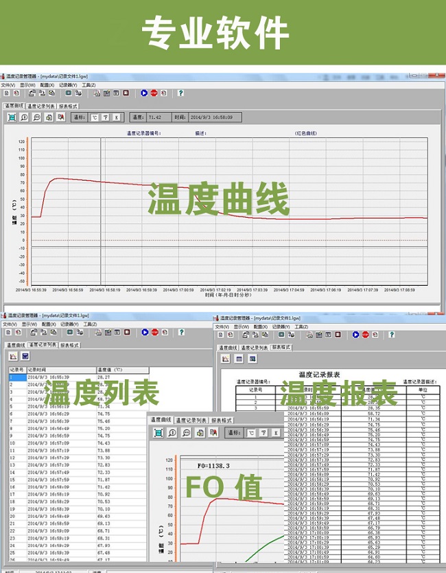 专业配套软件提供了仪表的参数编程设置、数据下载、历史曲线、历史报表、FO值计算等功能。