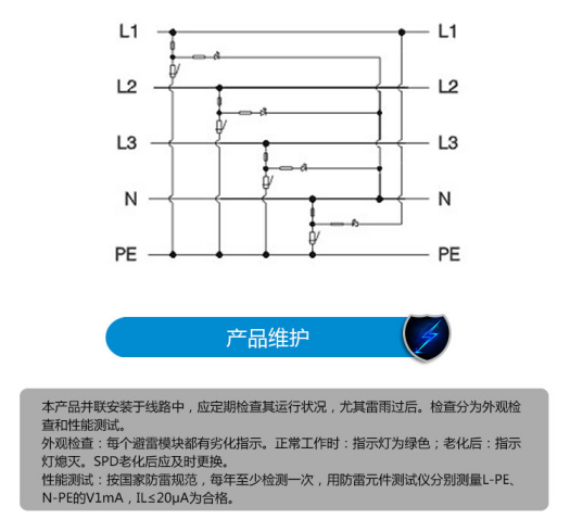 注:L为火线;N为电源零线;PE为地线。 | 应检查空气开关已经合闸导通,以保证避雷器处于运行状态; 不要在雷雨天安装。 |