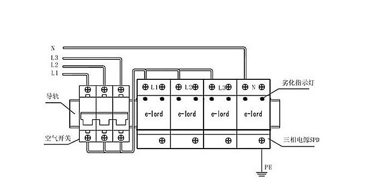 注:L为火线;N为电源零线;PE为地线。 | 应检查空气开关已经合闸导通,以保证避雷器处于运行状态; 不要在雷雨天安装。 |
