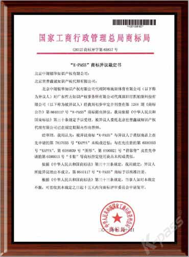 “K-PASS”商标异议裁定书