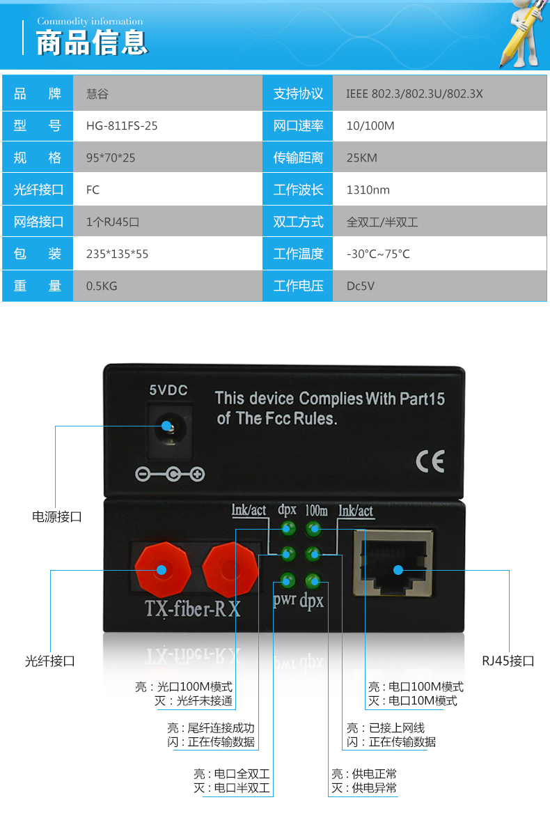 慧谷百兆光纤收发器单模双纤FC