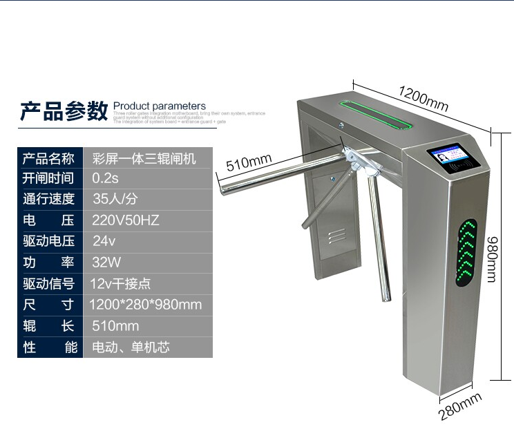 8、机械式和半自动式三辊闸的闸杆运转过程中会有机械碰撞,噪音较大,全自动三辊闸则没有这个问题。