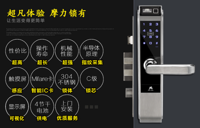 以摩力指纹锁为例,摩力的家用指纹锁通常具备指纹、密码以及感应卡三种开锁方式,有特殊需求还可增加遥控、微信、APP开锁功能,这些开锁方式基本满足日常所有的开锁场景。如家庭成员可录入指纹通过指纹锁开锁;亲友突然来访,可告知其开门密码;有亲友来暂住,可用感应卡供其日常使用。