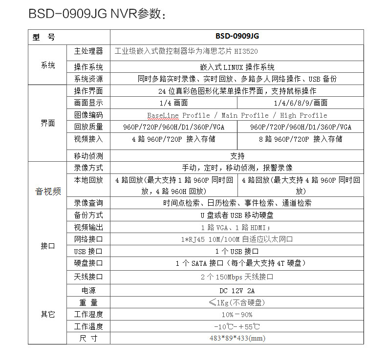 无线网络免布线、双阵列红外、高清夜视、IP66室外防水防尘级别、移动侦测、报警录像。工业级嵌入式海思芯片HI3520、同时多路实时录像、实时回放、USB备份