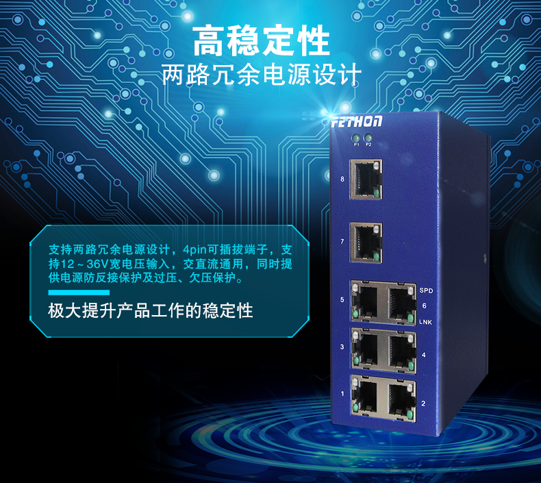 2.支持两路冗余电源设计,4pin可插拔端子,支持12~36V宽电压输入,交直流通用,同时提供电源防反接保护及过压、欠压保护,极大提升产品工作的稳定性