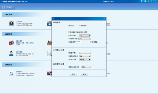 平台客户端的主要功能有:实时监视、录像回放、电子地图、报警管理、云台控制、语音对讲、视频上墙,以及本地配置等功能。客户端的主界面如下,