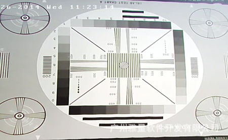 检测2-清晰度:由于全景摄像机的全景画面会造成畸变,于是我们在其四分之一的分割画面中,将摄像机对准清晰度测试卡,在0变倍下,发现其水平清晰度可达500TVL,垂直清晰度可达600 TVL左右,边缘清晰度稍差,灰度等级十级可见。