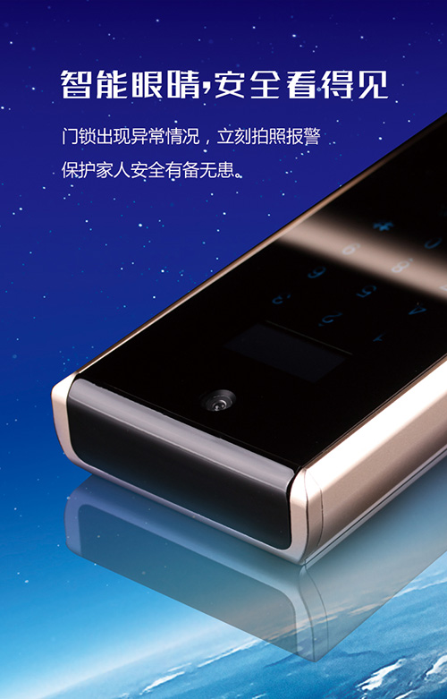 德犬手机门锁还有摄像头以及语音对讲按钮功能。如果有人企图技术开锁,一旦揭开机械钥匙孔盖,摄像头自动拍照并推送报警信息至主人手机。