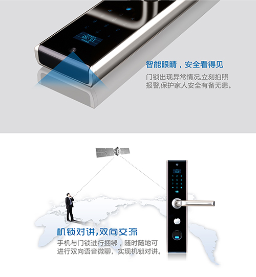 智能眼睛,拍照传送。门锁受到非法入侵,会第一时间拍摄照片上传服务器,并发送报警提醒至手机APP。