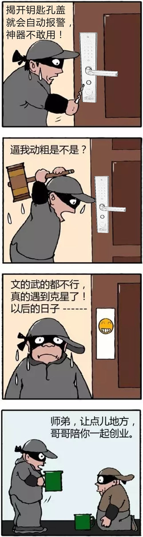 目前,我国的智能家居时代显然已来临,就如德犬智能家用安全装备的德犬手机门锁,可以让您的家变得像保险箱一样安全,通过手机APP操控,同时可以用手机来开锁。让我们通过两幅搞笑的漫画,一起来看看这款手机门锁有多神奇!